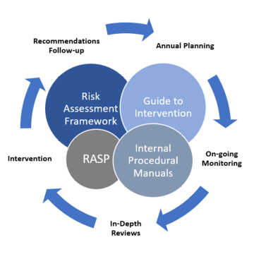 The supervision of PPPs is guided by The Risk Assessment Framework, Guide to Intervention, and Internal Procedural Manuals. It is a continuous process consisting of annual planning, on-going monitoring, in-depth reviews, intervention and recommendation follow-up, and facilitated by RASP.