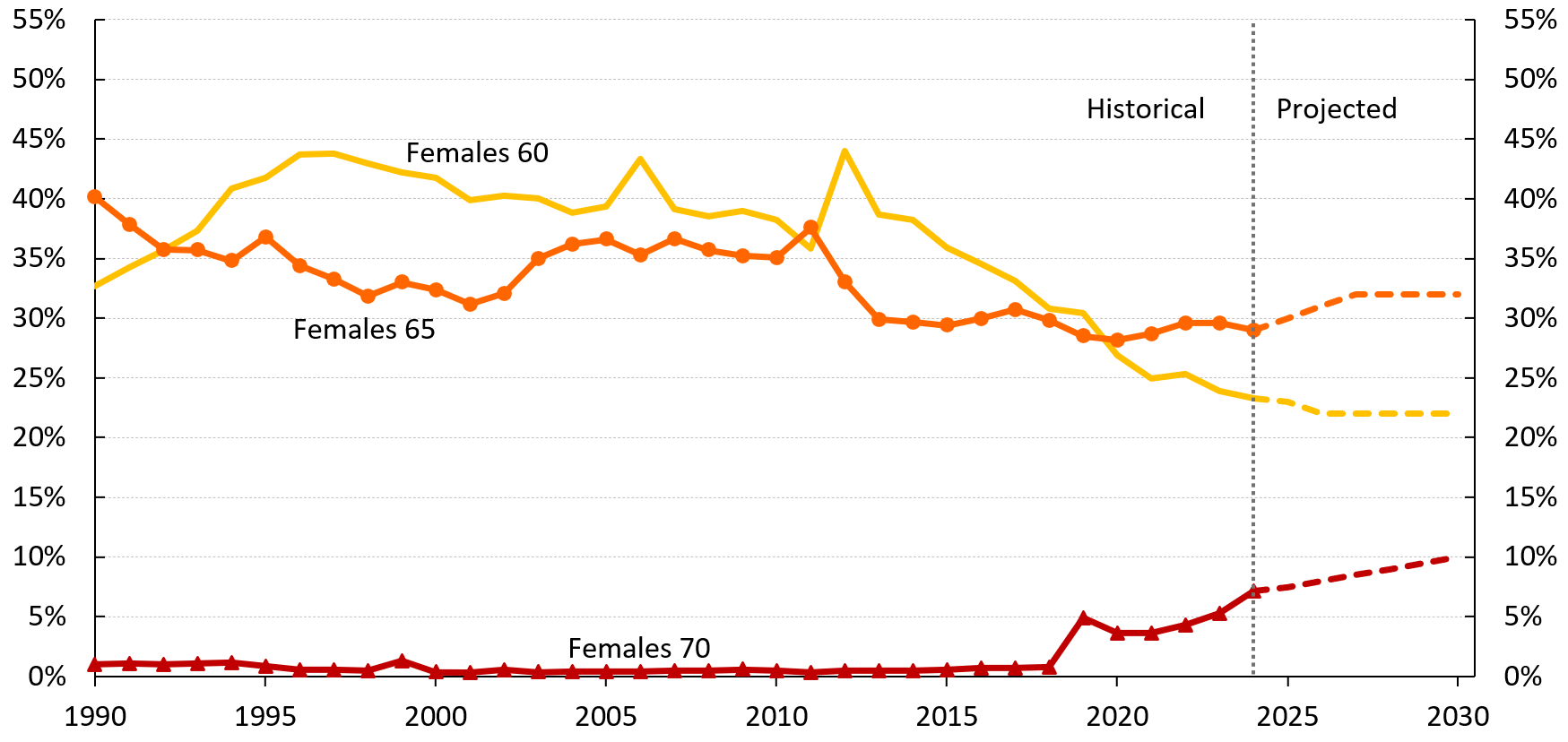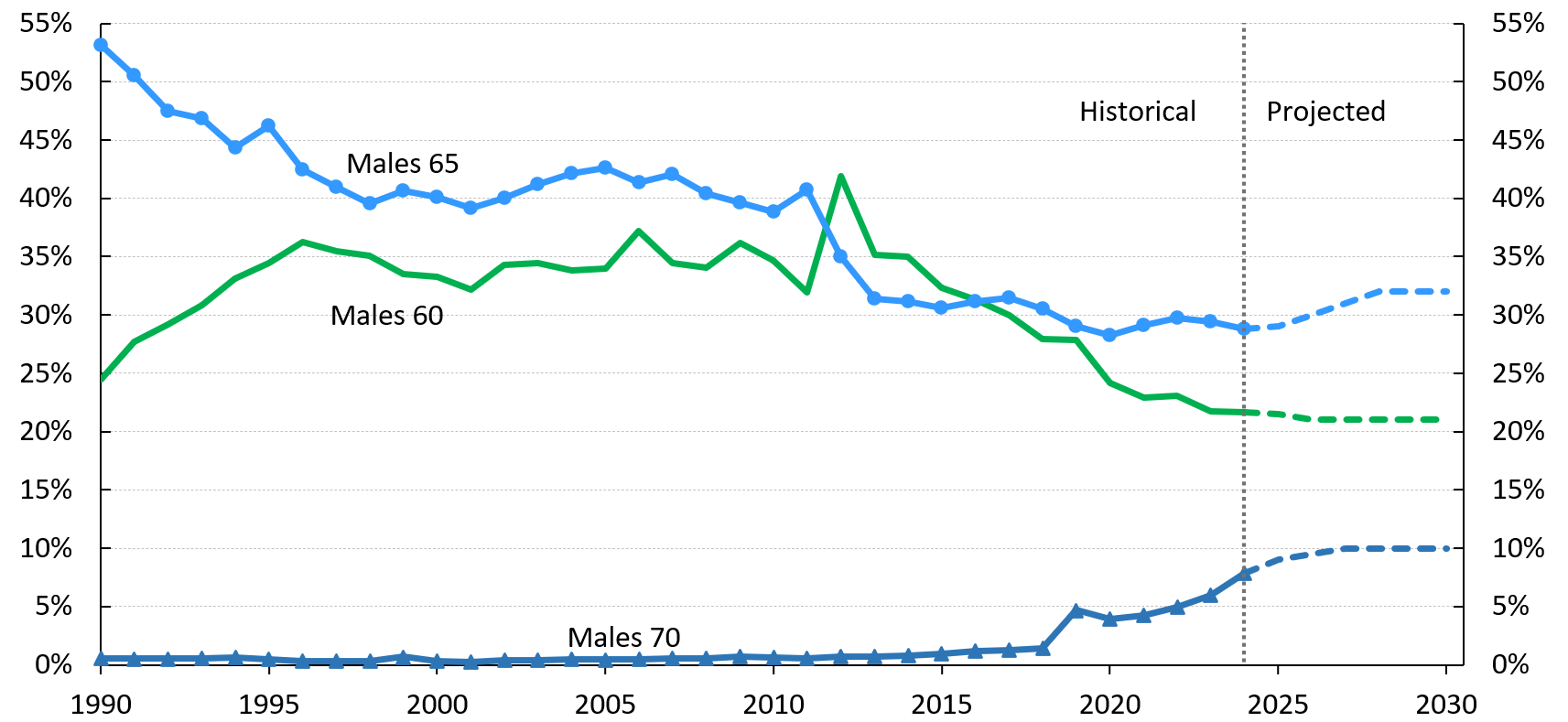 | Age 60 | Ages 50-59: same as best-estimate ages 60-64 | 6.6% (2028+) |