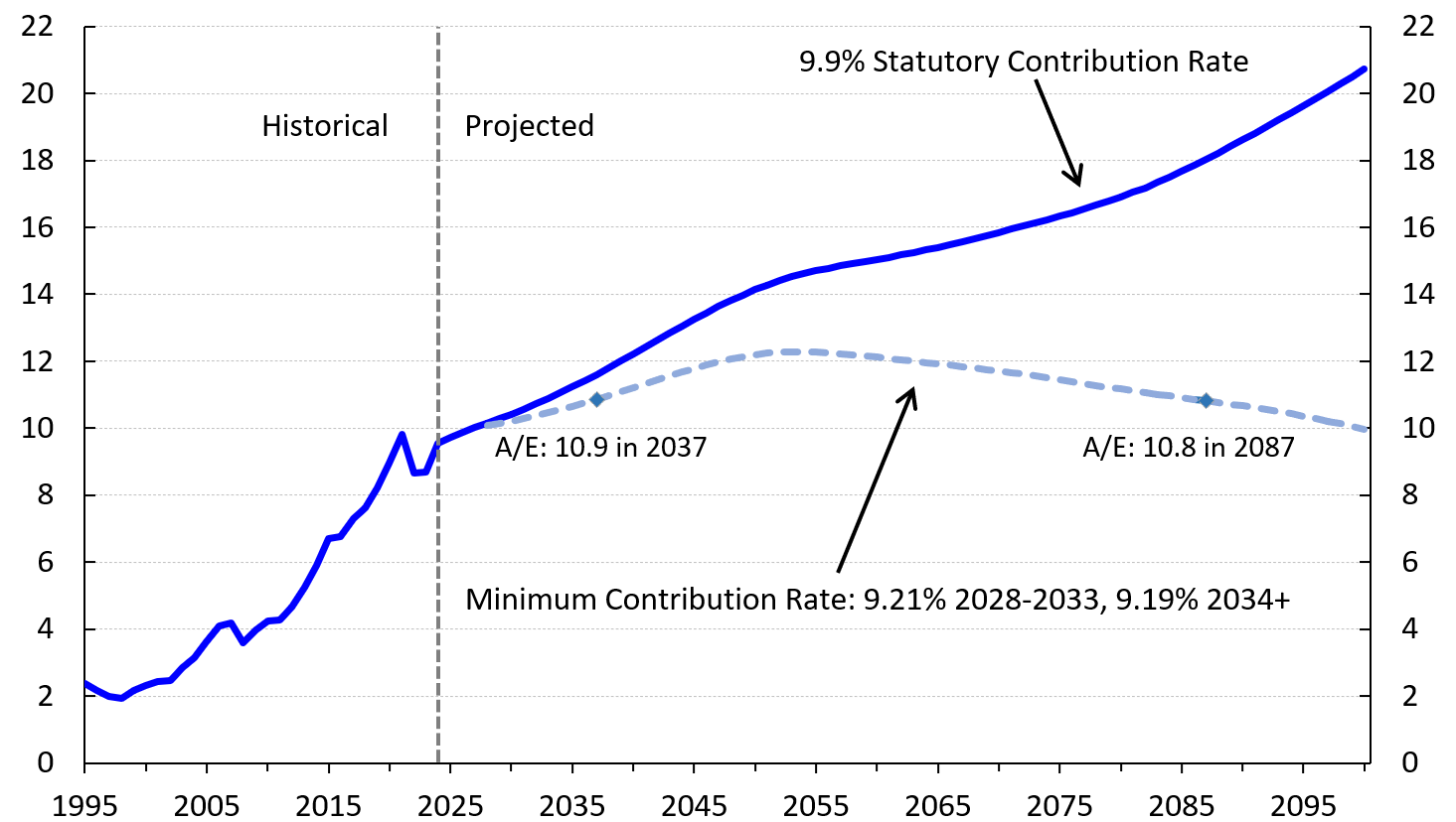 - Table 14 Financial projections - base CPP, minimum contribution rate of 9.21% for 2028 to 2033, 9.19% for 2034+