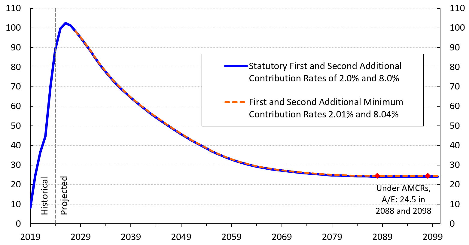Note that the adjustment factors determined as a result of this analysis do not ensure that the steady-state contribution rate and AMCRs will remain the same independent of the actual or assumed retirement pension take-up rates. That is, as individuals start their CPP pension at different ages, rather than collectively at a single age, the application of the calculated adjustment factors may lead to variations in the steady-state contribution rate and AMCRs.
