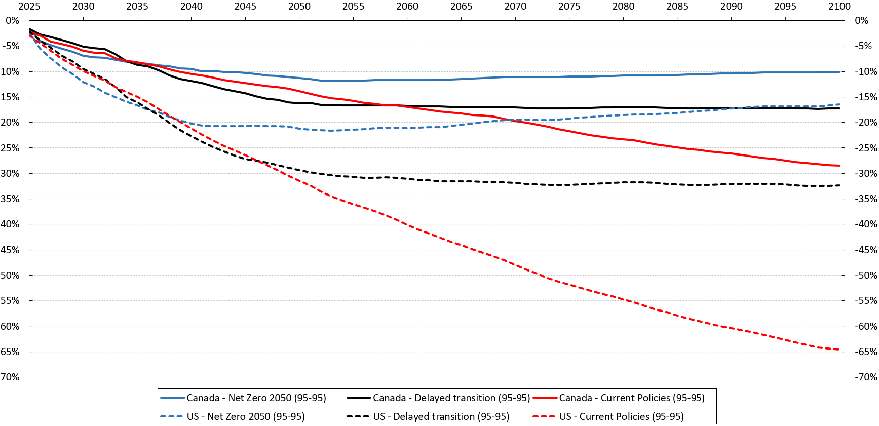 As shown in Table 116 and Table 117, climate change may have significant impacts on the underlying economic and investment assumptions and therefore on the base CPP MCR. Under the set of downside risk scenarios, the investment returns are lower in the Delayed Transition narrative and even lower in the Current Policy narrative, which lead to large increases in the base CPP MCR under those narratives. Additionally, the lower real wage increases also increase the base CPP MCR under all three scenario narratives. Under the set of Delayed Transition scenarios, there would be diverging impacts on the base CPP MCR. At the median risk level of damage function, the average investment returns and the average real wage increases are similar to those under the best-estimate assumptions, and as such, result in minimal changes to the base CPP MCR. Although the MCR remains unaffected, this does not imply that the report's best estimate is based on the delayed transition 50-50 scenario. At the 5th and 95th risk levels of damage function, there would be a moderate impact on the base CPP MCR, but of opposite direction.