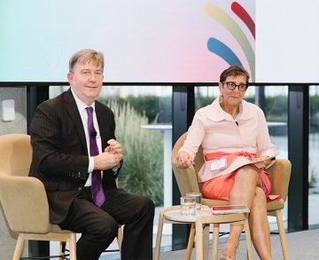 Peter Routledge, surintendant du BSIF (gauche), Sonia Baxendale, présidente et chef de la direction, Institut du risque mondial (right) au Sommet 2025 de l'Institut du risque mondial.